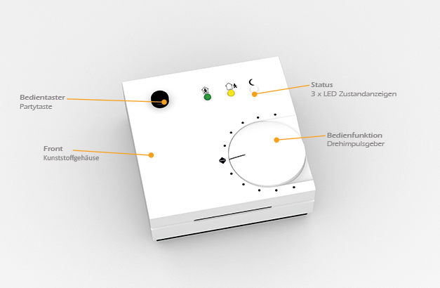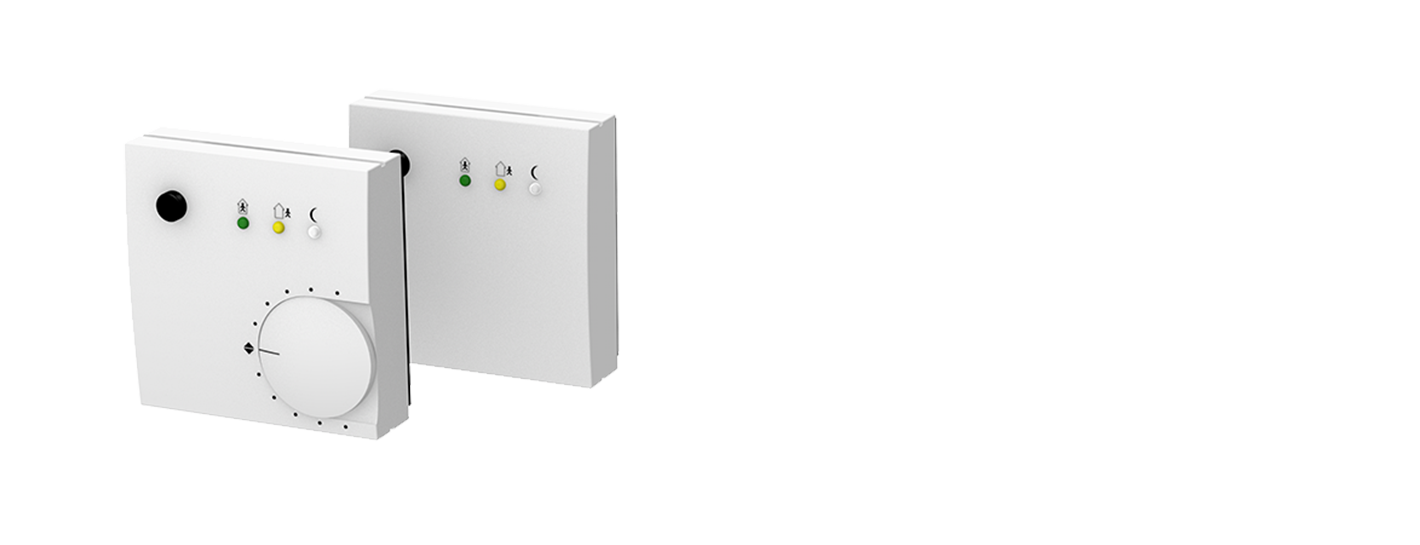 Raumregelgeräte mit Drehknopf zur Sollwertverstellung mit integriertem Raumtemperaturfühler, sowie drei Zustandsanzeigen mittels LED und Präsenz-/Partytaste. Der Datenaustausch erfolgt über CAN-Bus oder RS 485 (Modbus RTU). Die Raumregelung kann wahlweise über die zentrale Steuereinheit, als auch über eine fest im Raumregelgerät integrierte Regelfunktion erfolgen. Die Raumregelgeräte mit Triac-Ausgängen können Ventile mit 24 VAC über einen PWM Modus steuern. Geräte mit Analogausgängen 0..10 VDC sind zur Steuerung von analogen Ventilen vorgesehen.