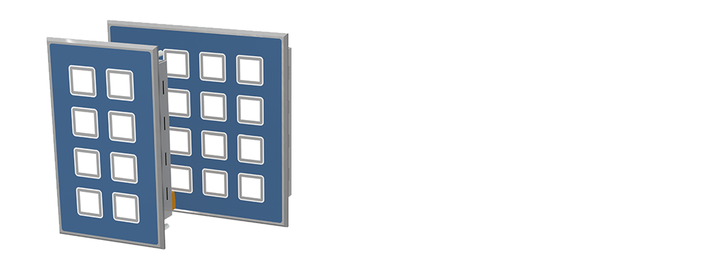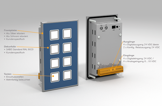 Die Bedienfeldbaugruppen sind Feldbuskomponenten mit CAN und RS 485 Schnittstellen. Die Beleuchtung der Tasten kann softwaremäßig individuell programmiert werden. Die Tasten sind wie digitale Eingänge, die Farben wie digitale Ausgänge zu behandeln. Die Erweiterungsoptionen digital / analog I/O`s sind für externe Bedien- und Anzeigeelemente wie z.B. Schlüsselschalter, Signalgeber, Blinkleuchten, Potentiometer mit 0...10 V Solwertvorgabe, vorgesehen. Kundenspezifisches Frontplattendesign, auch mit individuellen Erweiterungen, auf Anfrage.