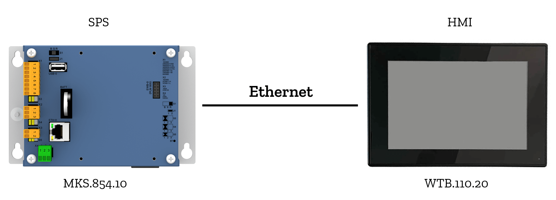 Das HMI-Web-Terminal knüpft an die SPS an und stellt die Anzeige- und Bedienoberfläche dar. Je nach Anforderung können auch mehrere HMI-Web-Terminals an eine SPS angeschlossen werden. Dies ist u.a. sinnvoll, wenn es an der Maschine mehrere Bedienerplätze gibt.